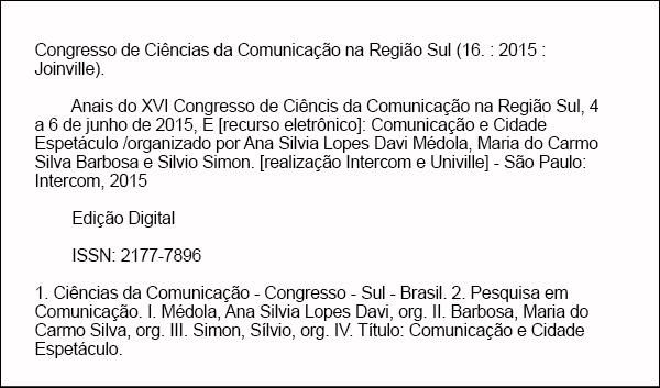 XVI Congresso de Ciências da Comunicação na Região Sul Data: 4 a 6 de junho de 2015 Local: Univille - Joinville - SC